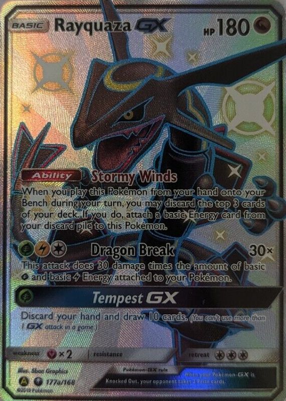 Rayquaza GX's Pokemon cards are available in at least 3 sets. Rayquaza GX's biggest 7-day price movers are 2018 Japanese Sun & Moon: GX Ultra Shiny #098/150 Double Rare, 2018 Sun & Moon: Celestial Storm #109/168 Holo, and 2018 Sun & Moon: Celestial Storm #177a Holo (Hidden Fates Promo).
