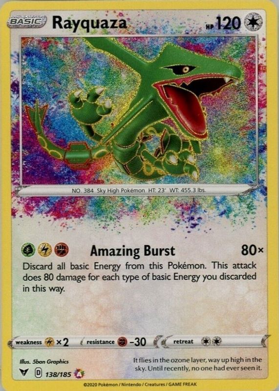 Rayquaza's Pokemon cards are available in at least 23 sets. Rayquaza's biggest 7-day price movers are 2025 Japanese Mega: Mega Dream ex #127/193 Energy Reverse Holo, 2026 Mega Evolution: Ascended Heroes #153/217 Holo, and 2012 Japanese BW-P Promo #144/BW-P Nobunaga's Ambition Pre-Order Bonus.