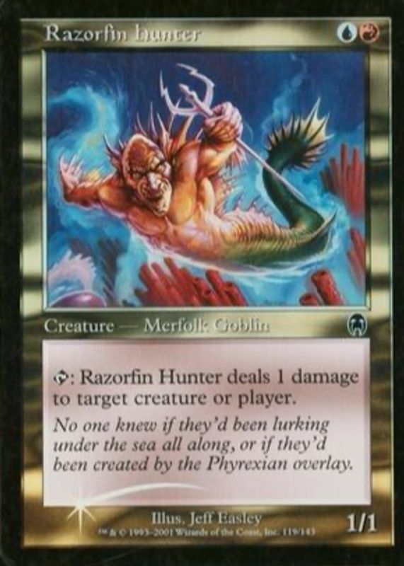 Razorfin Hunter's Magic: The Gathering cards are available in at least 1 sets. Razorfin Hunter's biggest 7-day price movers are 2001 Apocalypse #119 Foil, and 2001 Apocalypse #119 Base.