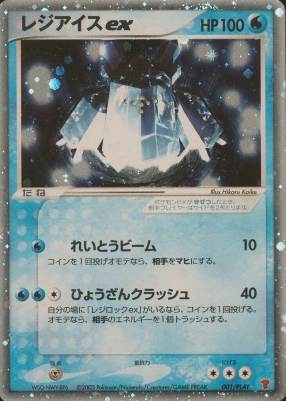 Regice ex's Pokemon cards are available in at least 4 sets. Regice ex's biggest 7-day price movers are 2004 EX: Hidden Legends #097/101 Holo, 2004 Japanese EX: Undone Seal #038/083 1st Edition Holo, and 2003 Japanese PLAY Promo #001/PLAY 1st Season Subscription.