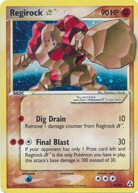 Regirock Star's Pokemon cards are available in at least 2 sets. Regirock Star's biggest 7-day price movers are 2006 EX: Legend Maker #91/92 Holo, 2005 Japanese EX: Mirage Forest #059/086 Unlimited Holo, and 2005 Japanese EX: Mirage Forest #059/086 1st Edition Holo.