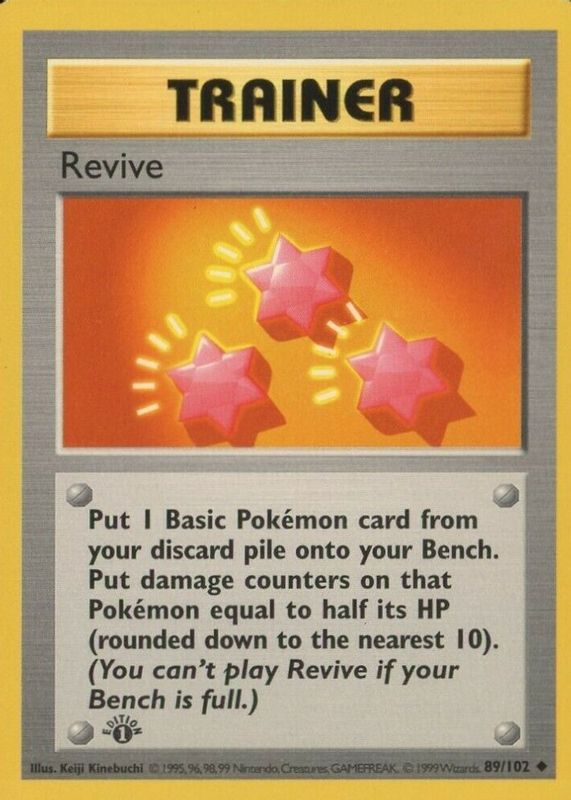 Revive's Pokemon cards are available in at least 6 sets. Revive's biggest 7-day price movers are 1999 Pokemon Game #89 1st Edition, 2011 Black & White #102/114 Base, and 2011 Black & White #102/114 Reverse Holo.