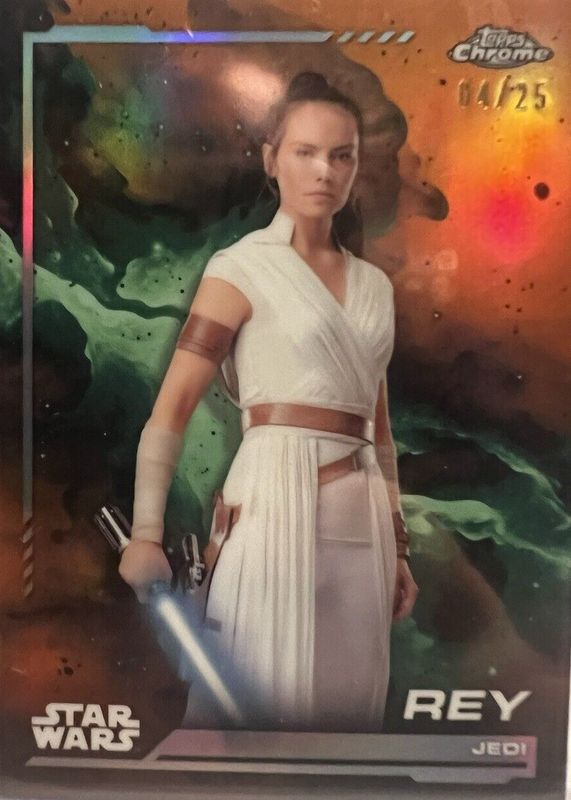 Rey's Star Wars cards are available in at least 21 sets. Rey's biggest 7-day price movers are 2024 Topps Chrome Star Wars #112 Rebel Orange Refractor /25, 2024 Topps Chrome Star Wars #112 Kamino Aqua Refractor /199, and 2024 Topps Chrome Star Wars #112 Rainbow Refractor.