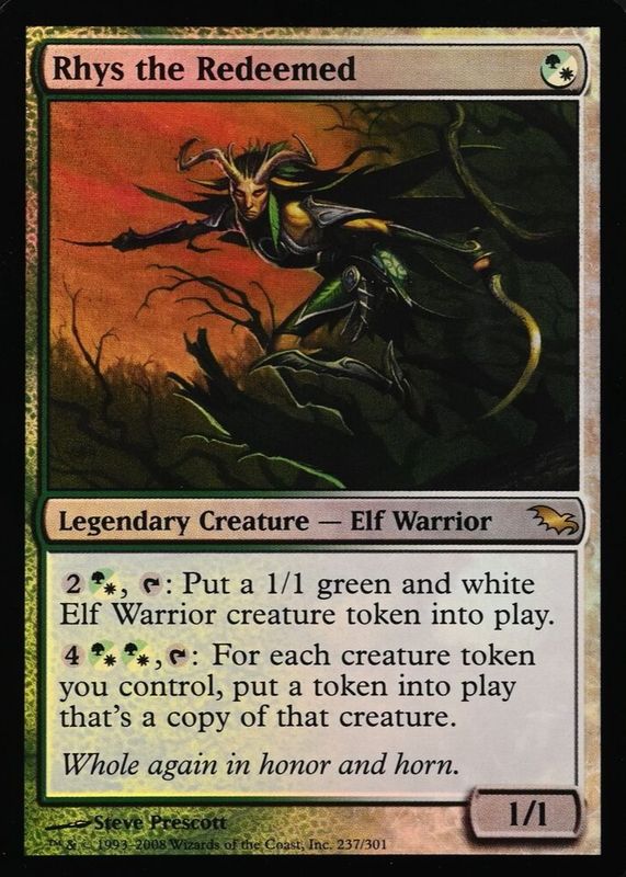 Rhys the Redeemed's Magic: The Gathering cards are available in at least 1 sets. Rhys the Redeemed's biggest 7-day price movers are 2008 Shadowmoor #237 Foil, and 2008 Shadowmoor #237 Base.