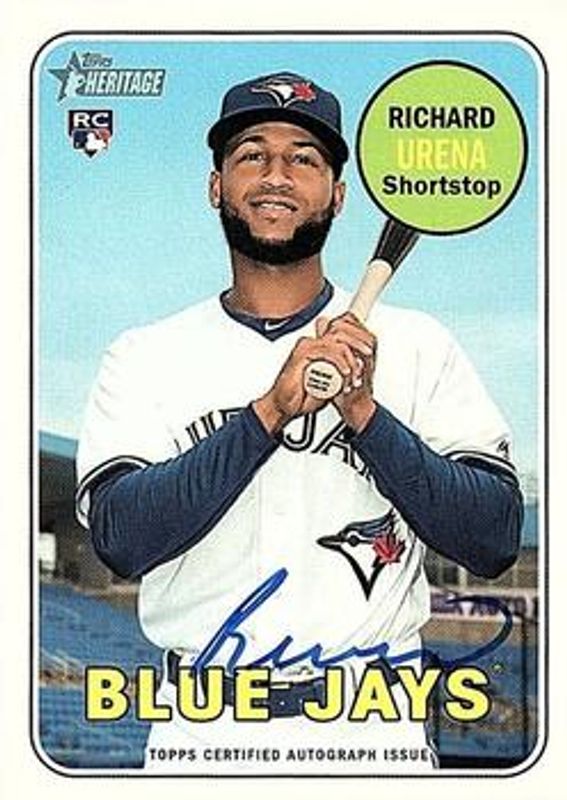 Richard Urena's Baseball cards are available in at least 5 sets. Richard Urena's biggest 7-day price movers are 2018 Topps Heritage #ROA-RU Real One Autographs High Number, 2018 Topps Heritage #ROA-RU Real One Autographs High Number - Red Ink /69, and 2018 Clearly Authentic #CAA-RU Black /75.