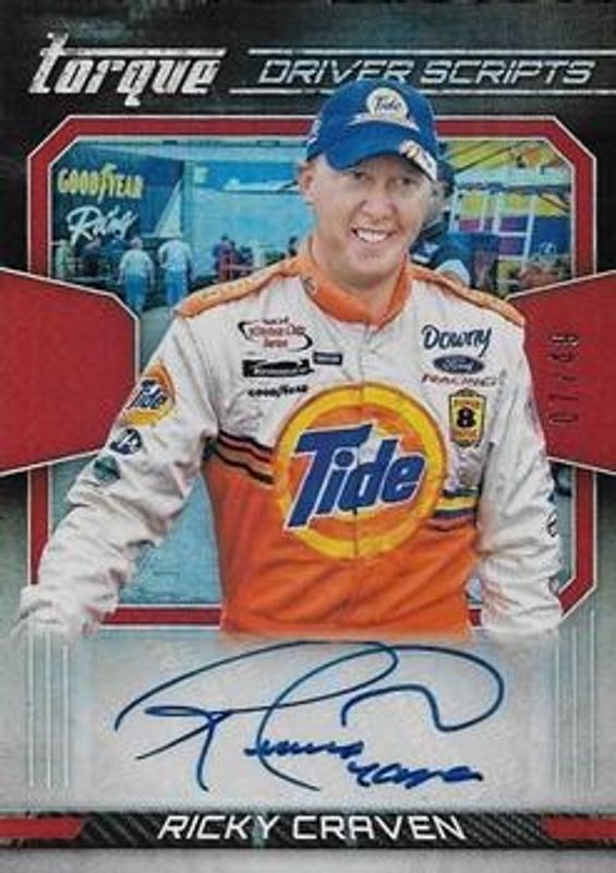 Ricky Craven's Racing cards are available in at least 12 sets. Ricky Craven's biggest 7-day price movers are 2017 Torque NASCAR #DS-RC Driver Scripts Red /49, 2017 Torque NASCAR #DS-RC Driver Scripts Checkerboard /10, and 2017 Torque NASCAR #DS-RC Driver Scripts.