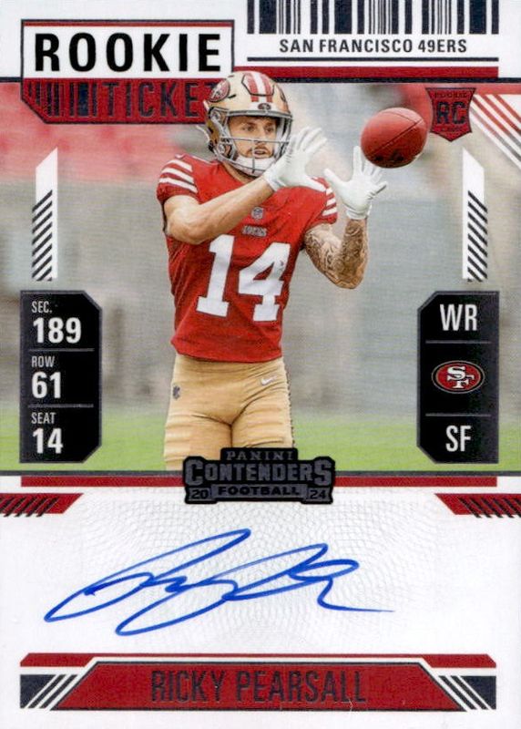 Ricky Pearsall's Football cards are available in at least 56 sets. Ricky Pearsall's biggest 7-day price movers are 2024 Origins #18 Original Gridiron, 2024 Mosaic #331 Reactive Blue, and 2024 Contenders #109 Rookie Ticket Auto.