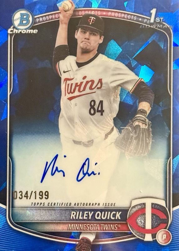 The biggest 30-day change Riley Quick cards are 2025 Bowman Draft Sapphire Edition #CPA-RQ Chrome Prospect Auto /199 (1st), 2025 Bowman Draft Sapphire Edition #CPA-RQ Chrome Prospect Auto - Gold /50 (1st), and 2025 Bowman Draft #CPA-RQ Chrome Prospect Auto - Blue Refractor /150 (1st).