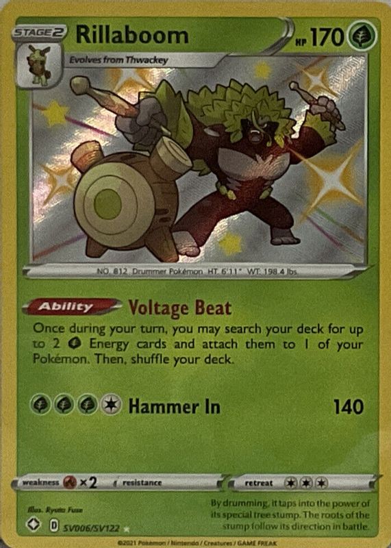 Rillaboom's Pokemon cards are available in at least 4 sets. Rillaboom's biggest 7-day price movers are 2020 Sword & Shield: Darkness Ablaze #197/189 Holo (Secret), 2021 Sword & Shield: Shining Fates #SV006 Shiny Rare, and 2020 Sword & Shield: Black Star Promo #SWSH006 Build & Battle Box (Sword & Shield Base) (Staff).