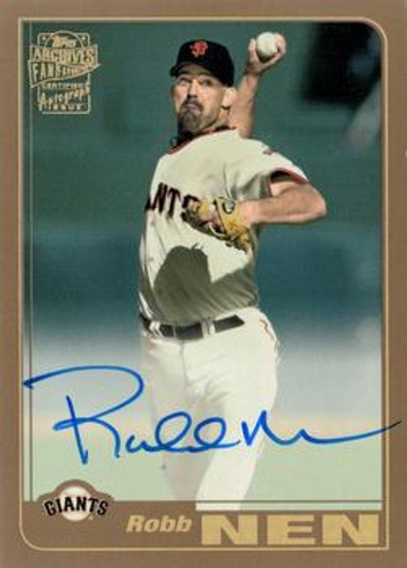 Robb Nen's Baseball cards are available in at least 37 sets. Robb Nen's biggest 7-day price movers are 2018 Topps Archives #FFA-RN Fan Favorites Autographs - Gold Foil /1, 2018 Topps Archives #FFA-RN Fan Favorites Autographs, and 2018 Topps Archives #FFA-RN Fan Favorites Autographs - Purple /150.