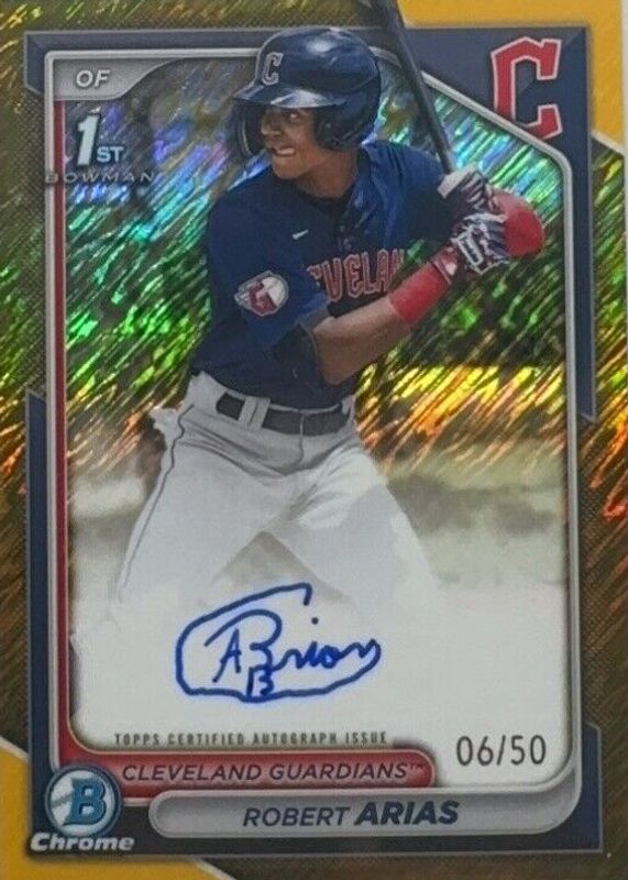 Robert Arias' Baseball cards are available in at least 1 sets. Robert Arias' biggest 7-day price movers are 2024 Bowman Chrome #CPA-RA Prospect Auto - Gold Shimmer Refractor /50 (1st), 2024 Bowman Chrome #CPA-RA Prospect Auto - Blue RayWave Refractor /150 (1st), and 2024 Bowman Chrome #CPA-RA Prospect Auto (1st).