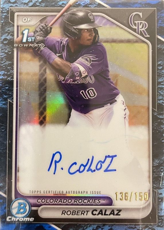 Robert Calaz's Baseball cards are available in at least 5 sets. Robert Calaz's biggest 7-day price movers are 2024 Bowman #CPA-RCA Chrome Prospect Auto - Blue Lunar Crater Refractor /150 (1st), 2025 Bowman Mega Box #BMA-RC Chrome Prospect Auto, and 2025 Bowman Mega Box #BMA-RC Chrome Prospect Auto - Black Refractor /10.
