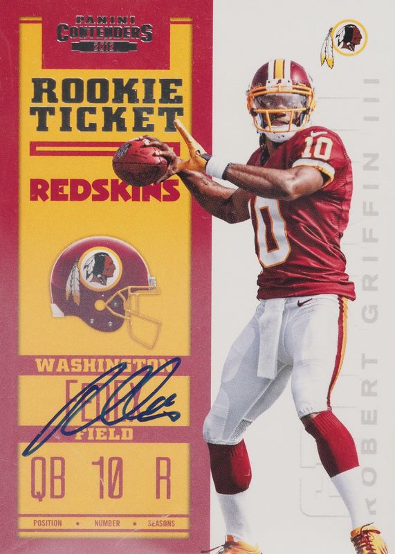 Robert Griffin III's Football cards are available in at least 47 sets. Robert Griffin III's biggest 7-day price movers are 2012 Contenders #202 Rookie Ticket Auto Variation (Throwing), 2012 National Treasures #302 Rookie Patch Auto - Gold /49, and 2013 Prizm #171 Black Finite /1.
