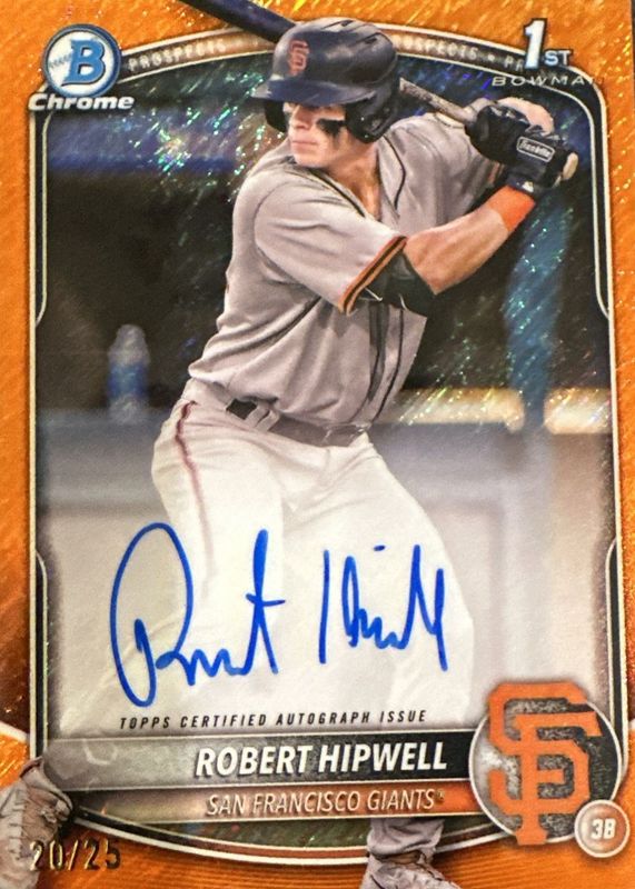 Robert Hipwell's Baseball cards are available in at least 2 sets. Robert Hipwell's biggest 7-day price movers are 2025 Bowman Chrome #CPA-RH Prospect Auto - Orange Shimmer Refractor /25 (1st), 2025 Bowman Chrome #CPA-RH Prospect Auto - Gold Shimmer Refractor /50 (1st), and 2025 Bowman Chrome #CPA-RH Prospect Auto - Gold Refractor /50 (1st).