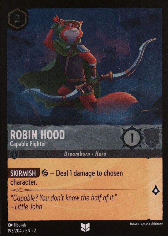 Robin Hood - Capable Fighter's Disney Lorcana cards are available in at least 2 sets. Robin Hood - Capable Fighter's biggest 7-day price movers are 2023 Rise of the Floodborn #193/204 Cold Foil, 2023 Rise of the Floodborn #193/204 Base, and 2025 Fabled #184/204 Base.
