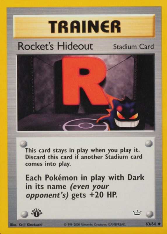 Rocket's Hideout's Pokemon cards are available in at least 4 sets. Rocket's Hideout's biggest 7-day price movers are 2001 Neo Revelation #63/64 Unlimited, 2001 Neo Revelation #63/64 1st Edition, and 2000 Japanese Awakening Legends Base.