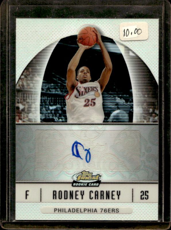 Rodney Carney's Basketball cards are available in at least 15 sets. Rodney Carney's biggest 7-day price movers are 2006 Topps Finest #63 Rookie Autographs Refractor /129, 2006 Topps Finest #63 Rookie Autographs Printing Plates Black /1, and 2006 Topps Finest #63 Rookie Autographs Printing Plates Cyan /1.