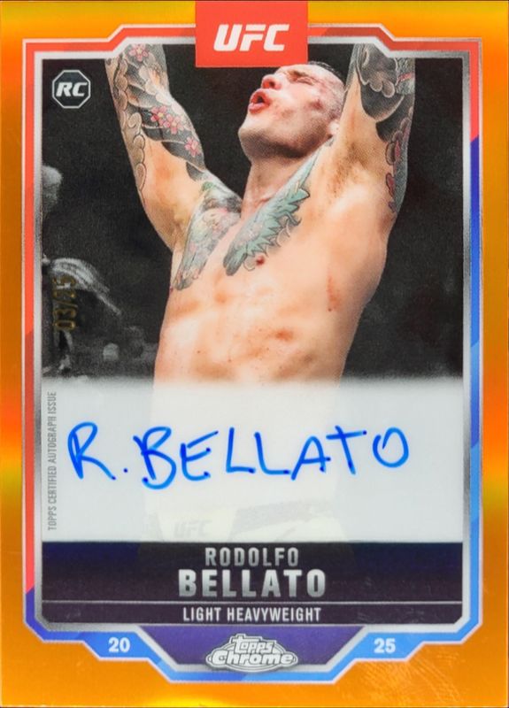 Rodolfo Bellato's MMA cards are available in at least 3 sets. Rodolfo Bellato's biggest 7-day price movers are 2025 Topps Chrome UFC #CRA-RB Chrome Rookie Autographs - Orange Refractor /25, 2025 Topps Chrome UFC #CRA-RB Chrome Rookie Autographs - Refractor /199, and 2025 Topps Chrome UFC #194 Blue Refractor /150.