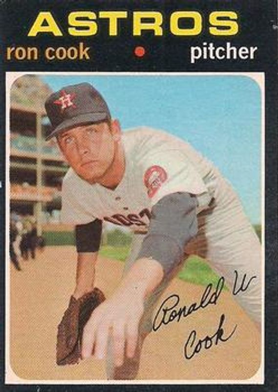 The biggest 30-day change Ron Cook cards are 1971 O-Pee-Chee #583 Base, 1971 Topps #583 Base, and 1972 Topps Cloth Test Base.