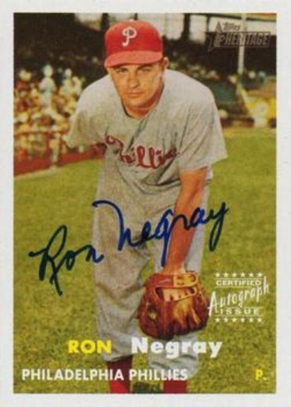 Ron Negray's Baseball cards are available in at least 4 sets. Ron Negray's biggest 7-day price movers are 2006 Topps Heritage #ROA-RN Real One Autographs, 2006 Topps Heritage #ROA-RN Real One Autographs - Red Ink /57, and 1956 Topps #7a Base.