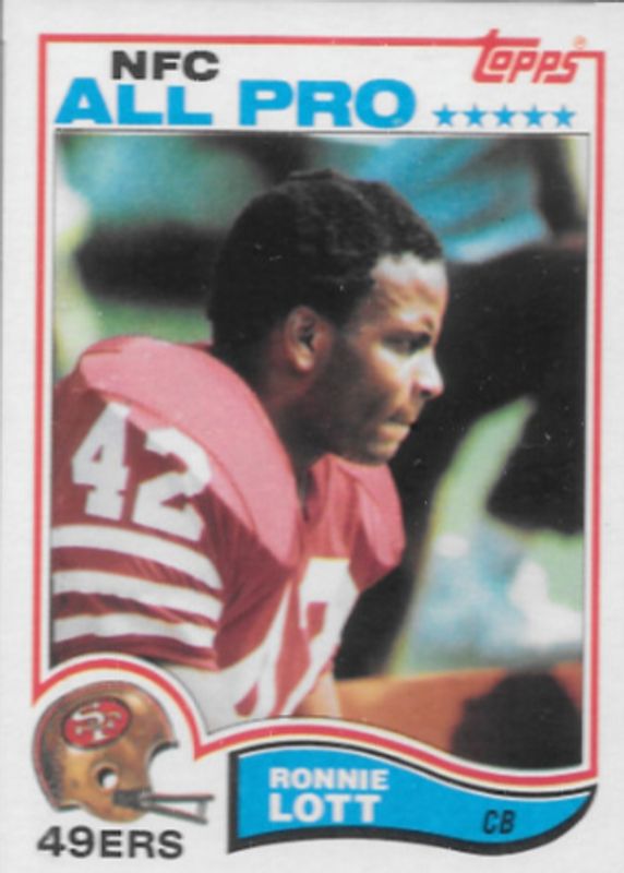 Ronnie Lott's Football cards are available in at least 64 sets. Ronnie Lott's biggest 7-day price movers are 1982 Topps #487 In Action, 1986 Topps #168 Base, and 1982 Topps #486 Base.