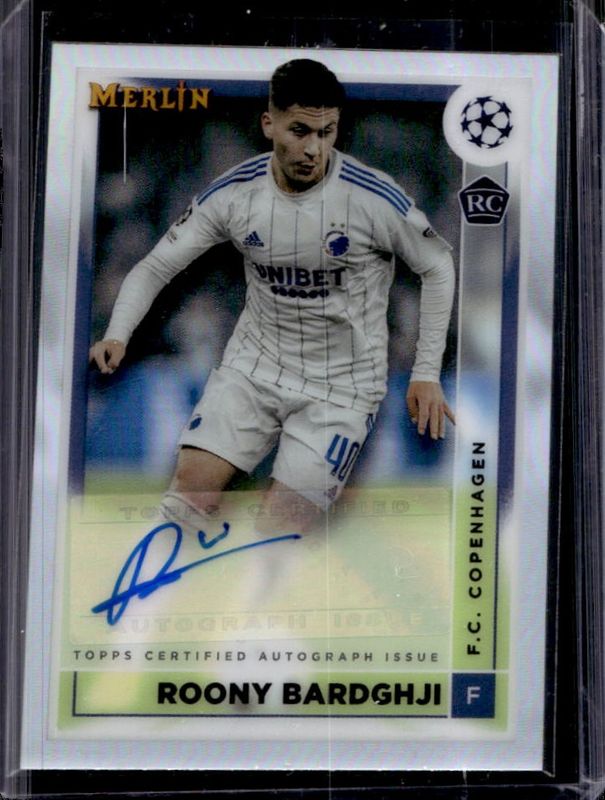 Roony Bardghji's Soccer cards are available in at least 22 sets. Roony Bardghji's biggest 7-day price movers are 2022 Topps Merlin Chrome UEFA Club Competitions #AC-RB Autographs, 2022 Topps Merlin Chrome UEFA Club Competitions #AC-RB Autographs - Blue Refractor /75, and 2022 Topps Merlin Chrome UEFA Club Competitions #AC-RB Autographs - Mojo Refractor /99.