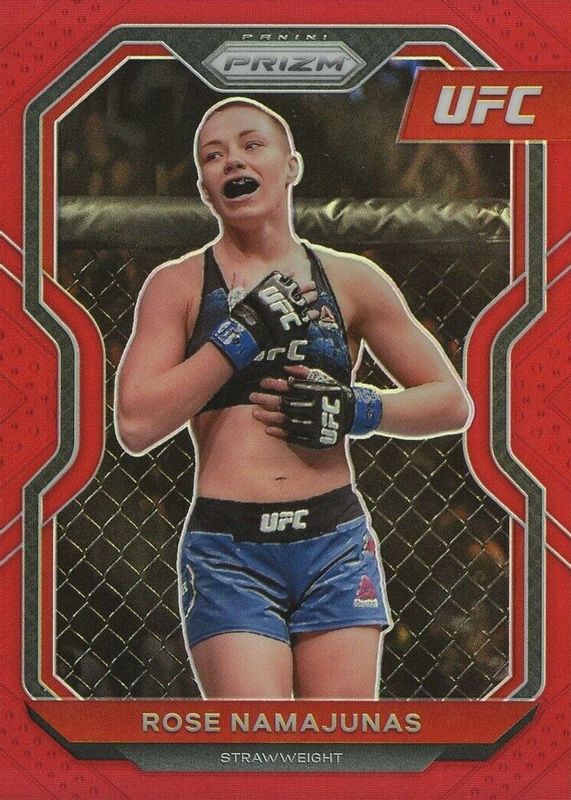 Rose Namajunas' MMA cards are available in at least 24 sets. Rose Namajunas' biggest 7-day price movers are 2021 Prizm UFC #31 Red /275, 2021 Select UFC #11 Concourse Lucky Envelopes /8, and 2021 Prizm UFC #31 Green Pulsar /25.
