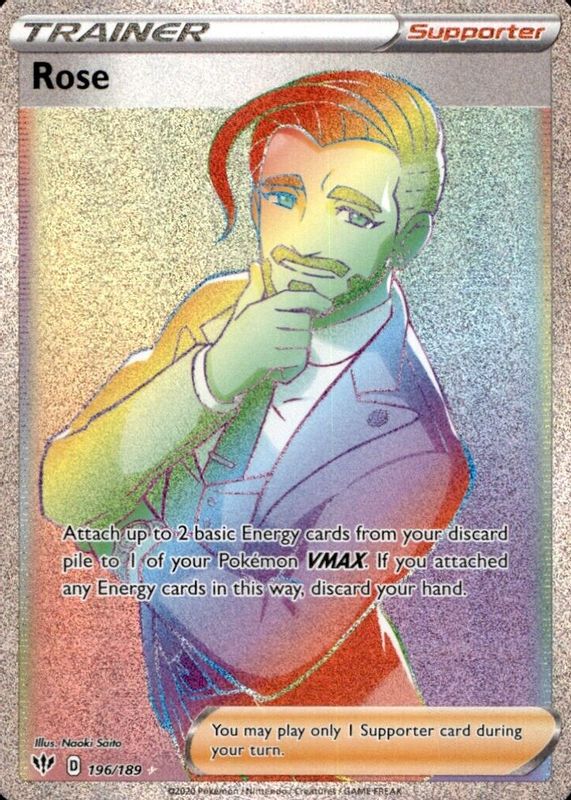 Rose's Pokemon cards are available in at least 4 sets. Rose's biggest 7-day price movers are 2020 Sword & Shield: Darkness Ablaze #196/189 Holo (Secret), 2020 Japanese Sword & Shield: Infinity Zone #110/100 Super Rare, and 2020 Sword & Shield: Darkness Ablaze #189/189 Holo (Full Art).