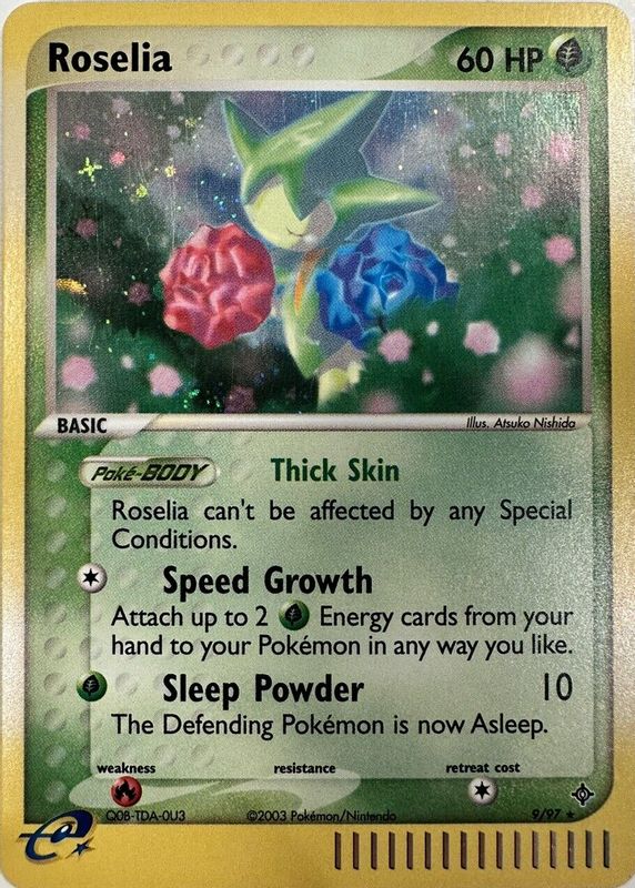 Roselia's Pokemon cards are available in at least 15 sets. Roselia's biggest 7-day price movers are 2003 EX: Dragon #09/97 Holo, 2006 EX: Legend Maker #42/92 Reverse Holo, and 2016 Japanese Hanafuda Mario Pikachu June.