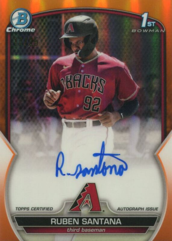 Ruben Santana's Baseball cards are available in at least 6 sets. Ruben Santana's biggest 7-day price movers are 2023 Bowman Chrome #CPA-RSA Prospect Auto - Orange Refractor /25 (1st), 2023 Bowman Chrome #CPA-RSA Prospect Auto - Gold Shimmer Refractor /50 (1st), and 2023 Bowman Chrome #CPA-RSA Prospect Auto - Green Refractor /99 (1st).
