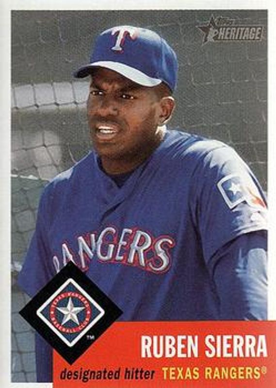 Ruben Sierra's Baseball cards are available in at least 82 sets. Ruben Sierra's biggest 7-day price movers are 2002 Topps Heritage #325 Base, 2003 Topps Heritage #284 Base, and 1988 Action Superstars Flagship #15 Base.