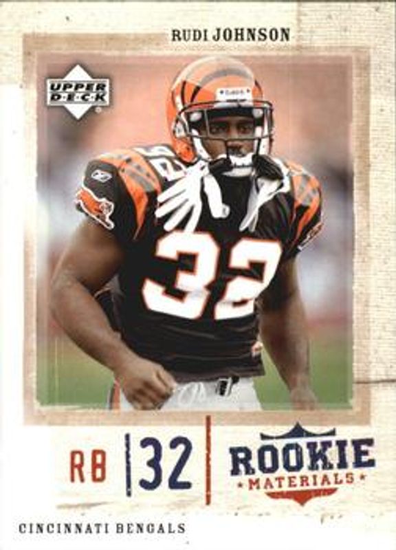 Rudi Johnson's Football cards are available in at least 8 sets. Rudi Johnson's biggest 7-day price movers are 2005 Upper Deck Rookie Materials #19 Base, 2001 Topps Finest #114 Base, and 2001 Topps Finest #RPJ-RJ Rookie Premiere Jerseys.
