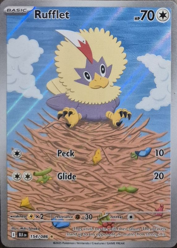 Rufflet's Pokemon cards are available in at least 14 sets. Rufflet's biggest 7-day price movers are 2025 Japanese Scarlet & Violet: White Flare #156/086 Art Rare, 2025 Scarlet & Violet: Black Bolt #154/086 Illustration Rare, and 2024 Scarlet & Violet: Surging Sparks #152/191 Reverse Holo.
