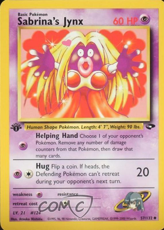 Sabrina's Jynx's Pokemon cards are available in at least 2 sets. Sabrina's Jynx's biggest 7-day price movers are 2000 Gym Heroes #059/132 1st Edition, and 2000 Gym Challenge #057/132 1st Edition.
