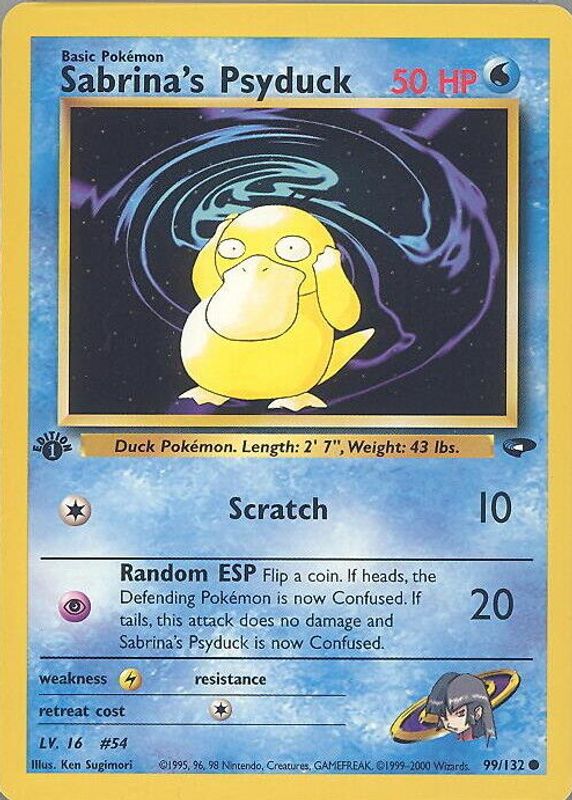 Sabrina's Psyduck's Pokemon cards are available in at least 1 sets. Sabrina's Psyduck's biggest 7-day price movers are 2000 Gym Challenge #099/132 1st Edition.