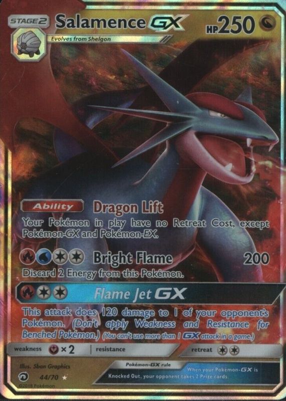 Salamence GX's Pokemon cards are available in at least 3 sets. Salamence GX's biggest 7-day price movers are 2018 Sun & Moon: Dragon Majesty #73/70 Holo (Secret), 2018 Sun & Moon: Black Star Promo #SM139 Special Collection (Dragon Majesty), and 2018 Japanese Sun & Moon: Champion Road #072/066 Super Rare (Full Art).