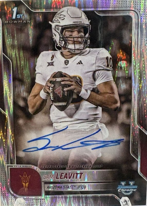 Sam Leavitt's Football cards are available in at least 23 sets. Sam Leavitt's biggest 7-day price movers are 2025 Prizm Draft Picks #6 Red /399, 2025 Prizm Draft Picks #6 Purple Ice /199, and 2025 Prizm Draft Picks #6 Silver.