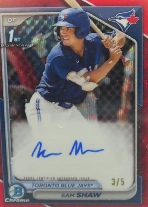 Sam Shaw's Baseball cards are available in at least 1 sets. Sam Shaw's biggest 7-day price movers are 2024 Bowman #CPA-SS Chrome Prospect Auto - Red Wave Refractor /5 (1st), 2024 Bowman #CPA-SS Chrome Prospect Auto - Refractor /499 (1st), and 2024 Bowman #CPA-SS Chrome Prospect Auto - Blue Refractor /150 (1st).