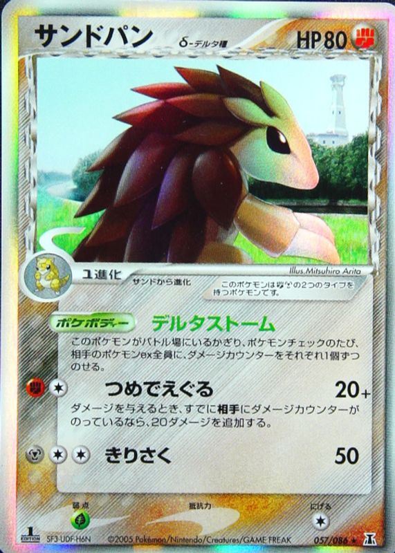 Sandslash's Pokemon cards are available in at least 25 sets. Sandslash's biggest 7-day price movers are 2005 Japanese EX: Holon Research Tower #057/086 1st Edition Holo, 2003 EX: Sandstorm #021/100 Reverse Holo, and 1997 Japanese Mystery of the Fossils #28 Base.