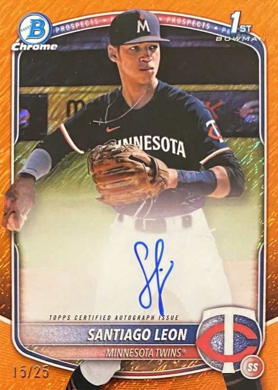Santiago Leon's Baseball cards are available in at least 3 sets. Santiago Leon's biggest 7-day price movers are 2025 Bowman Chrome #CPA-SL Prospect Auto - Orange Shimmer Refractor /25 (1st), 2025 Bowman Chrome #CPA-SL Prospect Auto - Gold Shimmer Refractor /50 (1st), and 2025 Bowman Chrome #CPA-SL Prospect Auto - Green Refractor /99 (1st).
