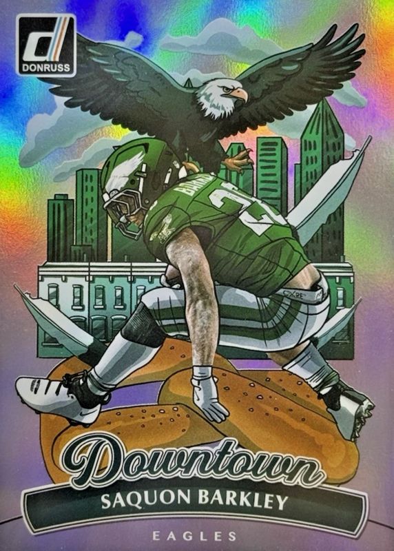 Saquon Barkley's Football cards are available in at least 113 sets. Saquon Barkley's biggest 7-day price movers are 2018 Donruss #ESR-6 The Elite Series Rookies, 2025 Mosaic #212 Choice Cherry Blossom /20, and 2023 Optic #D-13 Downtown /(SSP).
