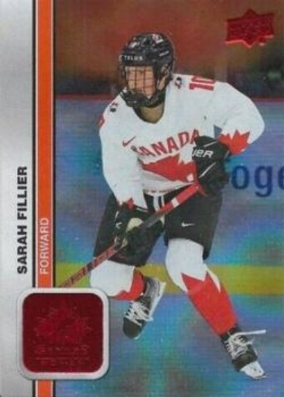 Sarah Fillier's Hockey cards are available in at least 3 sets. Sarah Fillier's biggest 7-day price movers are 2023 Upper Deck Team Canada Juniors #53 Patterned Foilboard Red, 2023 Upper Deck Team Canada Juniors #53 Base, and 2023 Upper Deck Team Canada Juniors #GT-1 Go to the Top.
