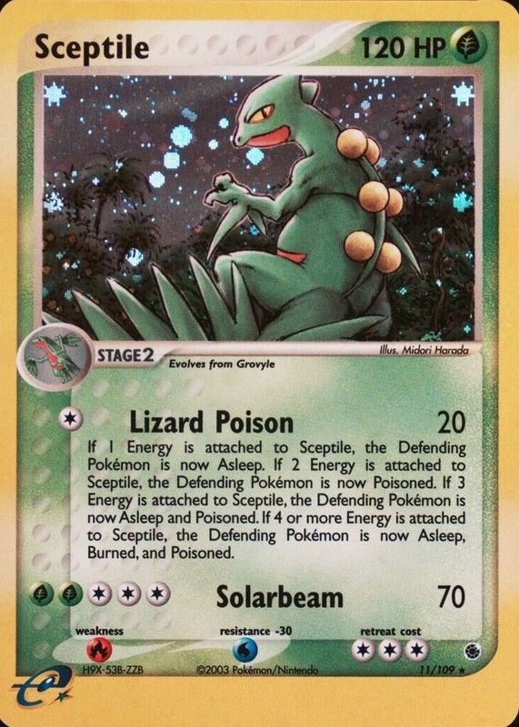 Sceptile's Pokemon cards are available in at least 16 sets. Sceptile's biggest 7-day price movers are 2008 Diamond & Pearl: Great Encounters #008/106 Holo, 2003 EX: Ruby & Sapphire #011/109 Holo, and 2003 EX: Ruby & Sapphire #020/109 Reverse Holo.