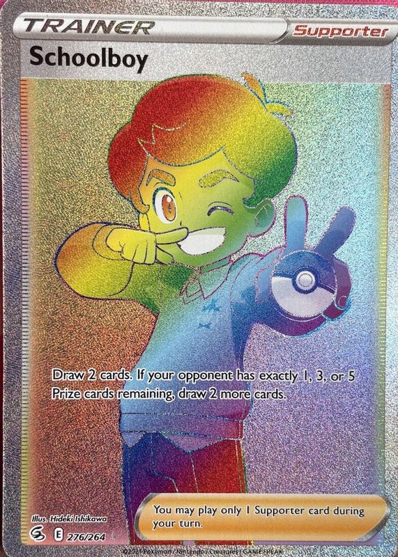 Schoolboy's Pokemon cards are available in at least 2 sets. Schoolboy's biggest 7-day price movers are 2021 Sword & Shield: Fusion Strike #276/264 Holo (Secret), 2021 Japanese Sword & Shield: Blue Sky Stream #085/067 Hyper Rare, and 2021 Sword & Shield: Fusion Strike #261/264 Holo (Full Art).