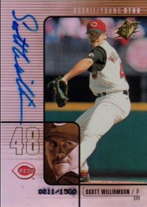 Scott Williamson's Baseball cards are available in at least 12 sets. Scott Williamson's biggest 7-day price movers are 2000 SPx #101 Base /1500, 2000 SPx #101 Radiance /100, and 2000 SPx #HH8 Highlight Heroes.