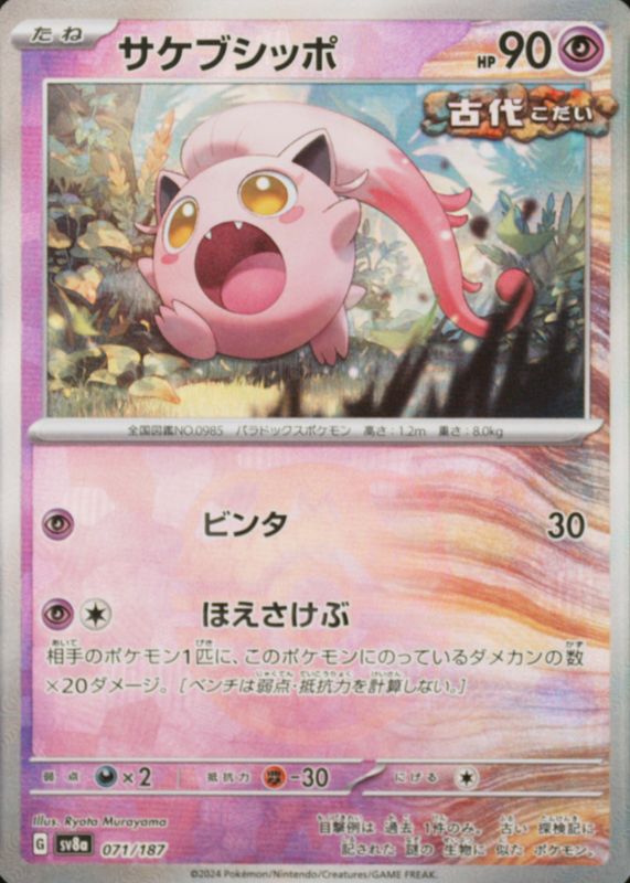 Scream Tail's Pokemon cards are available in at least 2 sets. Scream Tail's biggest 7-day price movers are 2024 Japanese Scarlet & Violet: Terastal Fest ex #071/187 Base, 2024 Japanese Scarlet & Violet: Terastal Fest ex #071/187 Reverse Holo, and 2024 Japanese Scarlet & Violet: Terastal Fest ex #071/187 Master Ball Reverse Holo.