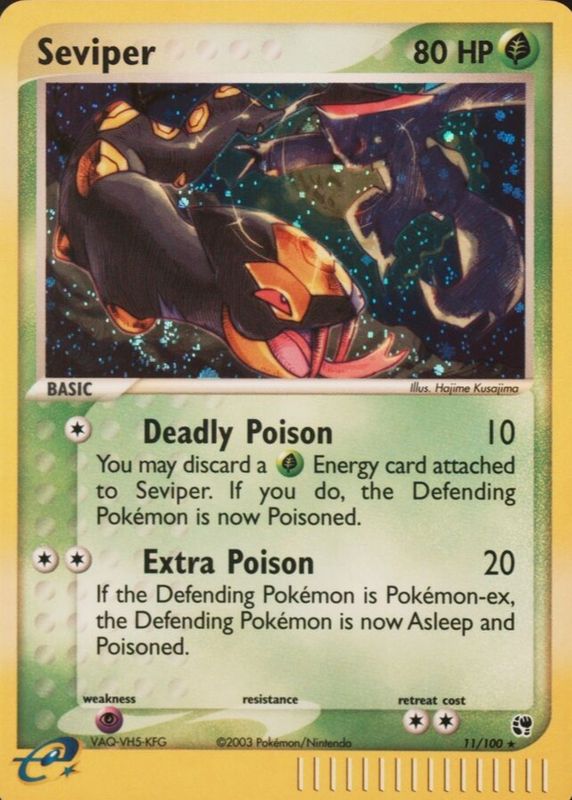 Seviper's Pokemon cards are available in at least 20 sets. Seviper's biggest 7-day price movers are 2003 EX: Sandstorm #011/100 Holo, 2005 EX: Emerald #020/106 Reverse Holo, and 2007 EX: Power Keepers #023/108 Reverse Holo.