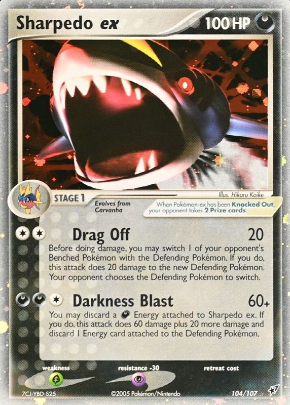 Sharpedo ex's Pokemon cards are available in at least 4 sets. Sharpedo ex's biggest 7-day price movers are 2005 EX: Deoxys #104/107 Holo, 2015 XY: Primal Clash #152/160 Holo (Full Art), and 2014 Japanese XY: Tidal Storm #074/070 1st Edition Holo (Full Art).
