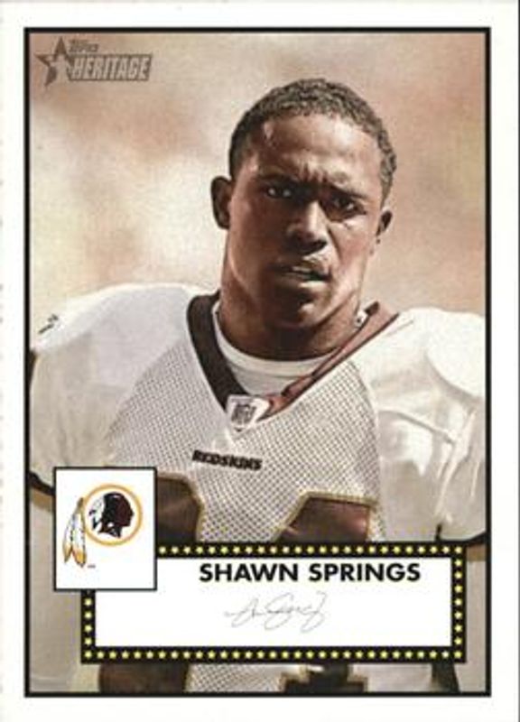 Shawn Springs' Football cards are available in at least 25 sets. Shawn Springs' biggest 7-day price movers are 2006 Topps Heritage #361 Base, 2005 Topps 1st Edition #240 Base, and 1999 Topps Stadium Club #36 Printing Plates Cyan.