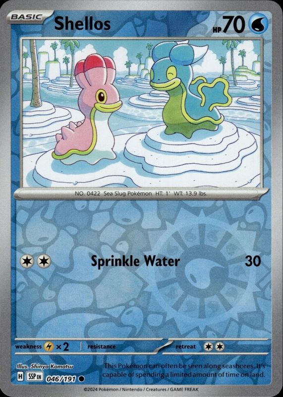Shellos' Pokemon cards are available in at least 6 sets. Shellos' biggest 7-day price movers are 2024 Scarlet & Violet: Surging Sparks #046/191 Reverse Holo, 2016 Japanese XY: Fever-Burst Fighter #013/054 1st Edition, and 2024 Japanese Scarlet & Violet: Super Electric Breaker #030/106 Base.